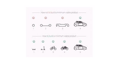 Our interactions with entrepreneurs indicate that most entrepreneurs mean MVP development to be the one represented in Panel 1. Through this, they are generally referring to the development phases of the product – lay the wheels of the car, then connect the transmission system, etc. before developing the car.