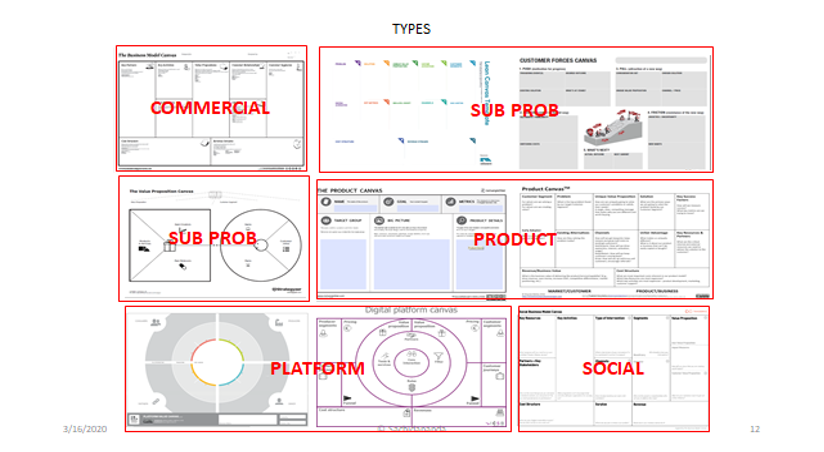 • Business canvases (choose the right tool for analysis)